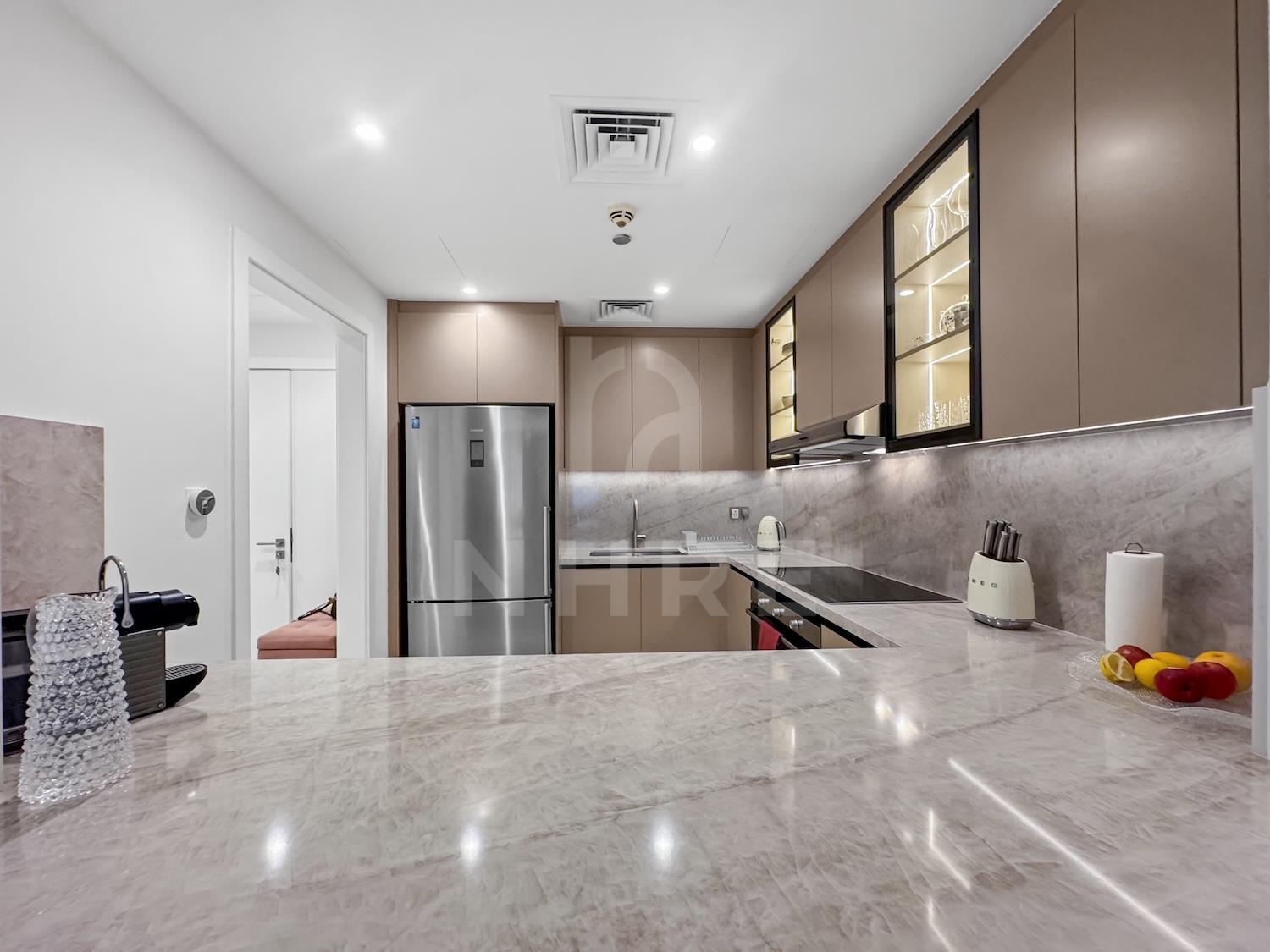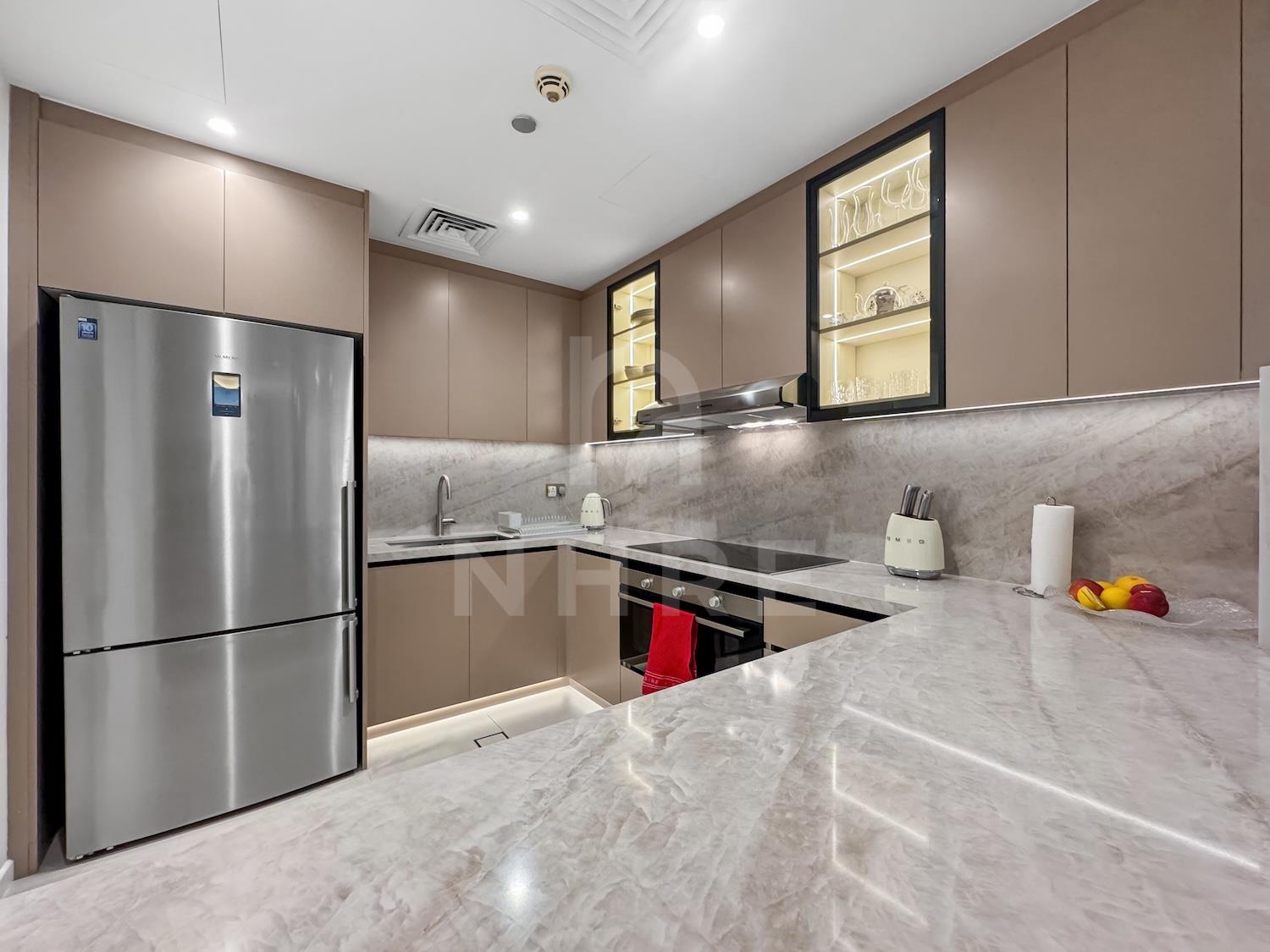 National Homes Real Estate LLC (NHRE) is pleased to offer this fully furnished and upgraded 3-bedrooms plus Maids room apartment for rent in Palm Jumeirah.